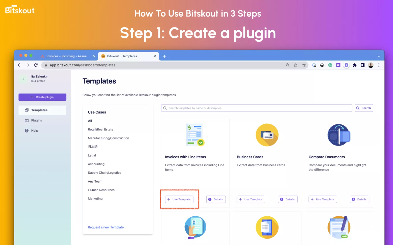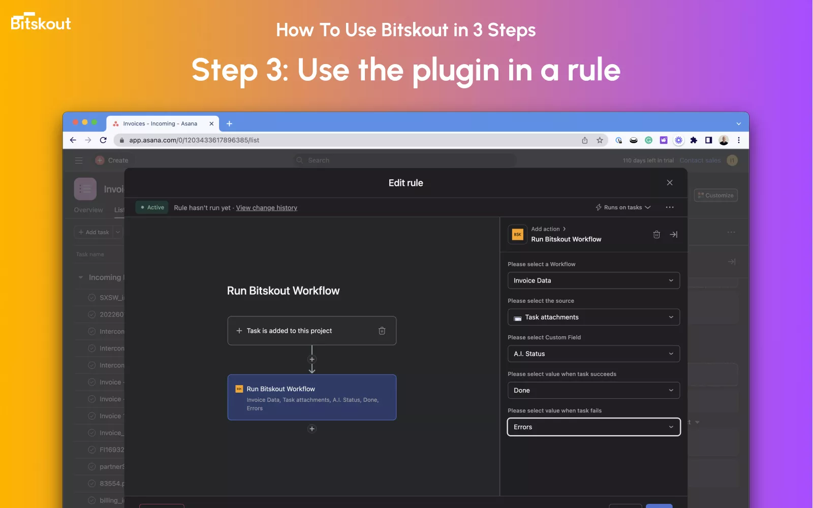 Bitskout helps teams automate manual data entry into their Asana projects. In Bitskout you create plugins that extract data from documents and emails and then use those plugins via Asana Rules.