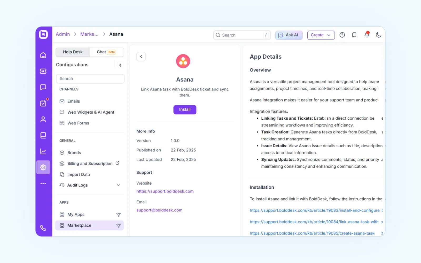 Follow these steps to install the Asana app through your BoldDesk® account: