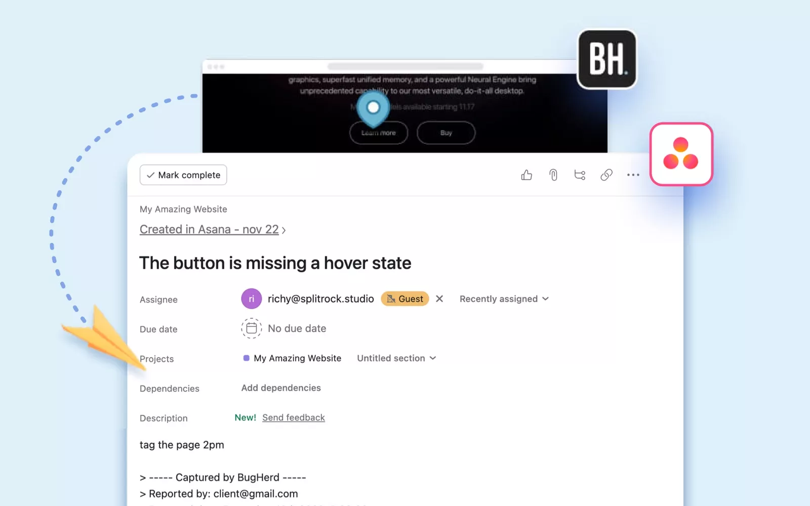 Integration of BugHerd with Asana. Free 14 day BugHerd trial is available from https://bugherd.com