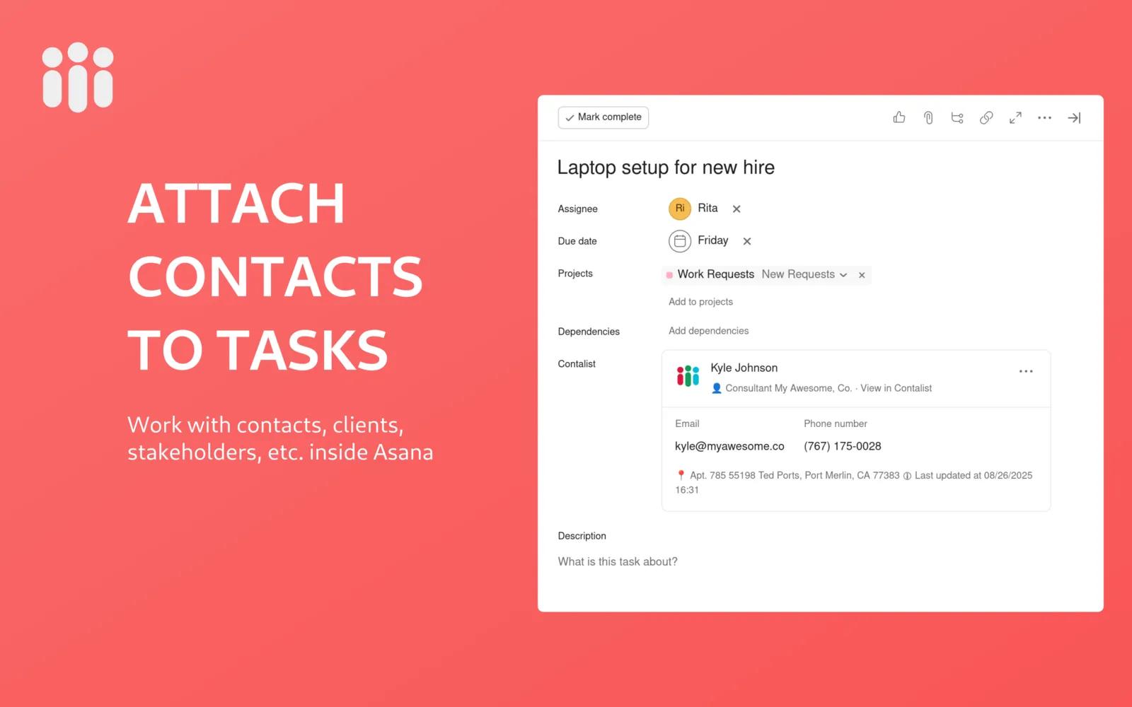 Add contacts to your tasks, and access their information inside Asana