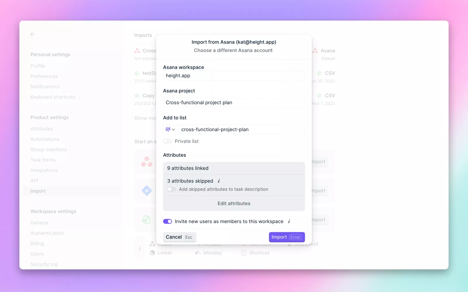 Our Height Asana Integration is used for importing Asana tasks and projects directly into Height