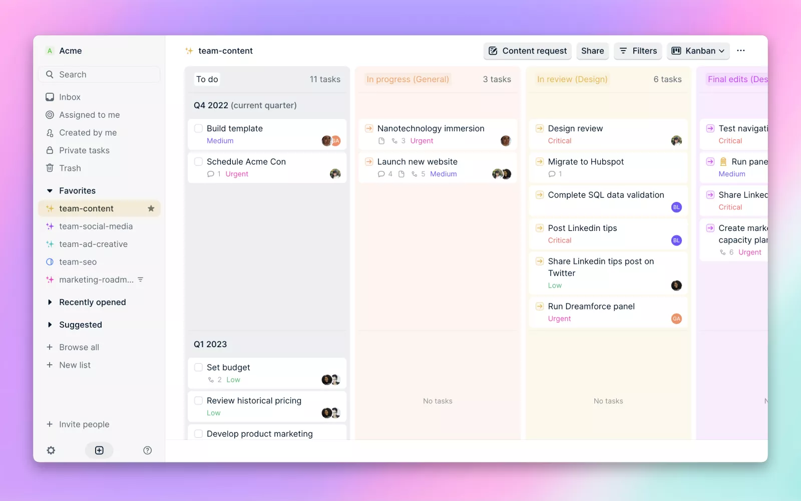 From the small stuff to the big picture, Asana organizes work so teams know what to do, why it matters, and how to get it done. It’s free to get started, simple to use, and powerful enough to run your entire business. Learn more about Asana today.