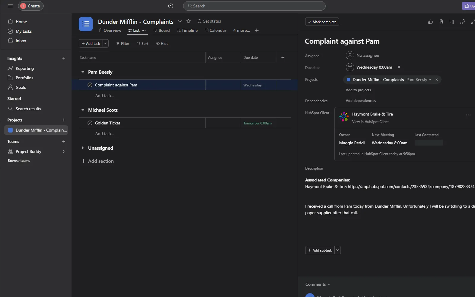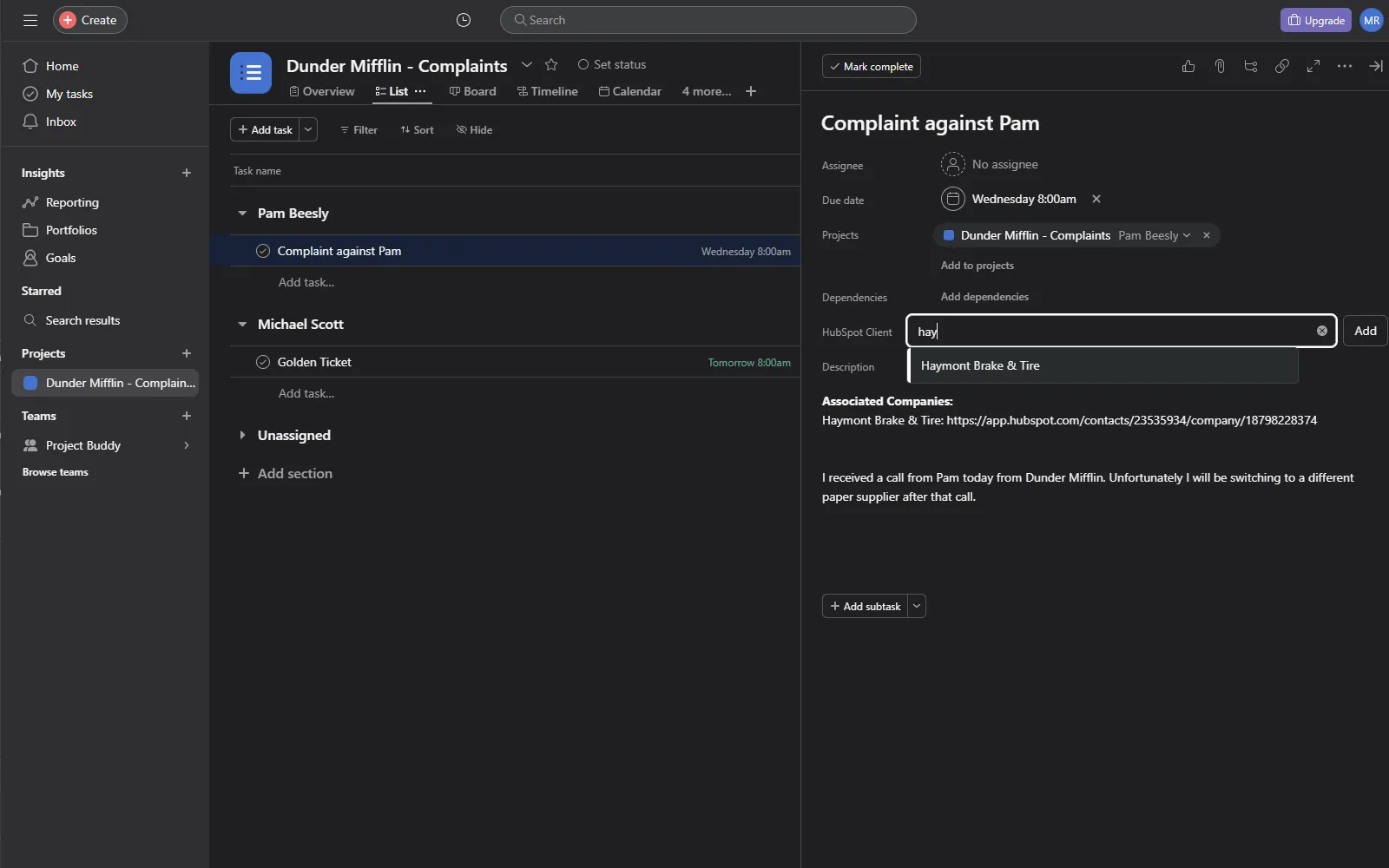 The integration lets you search for and link a task in Asana to a client (contact or company) in HubSpot.