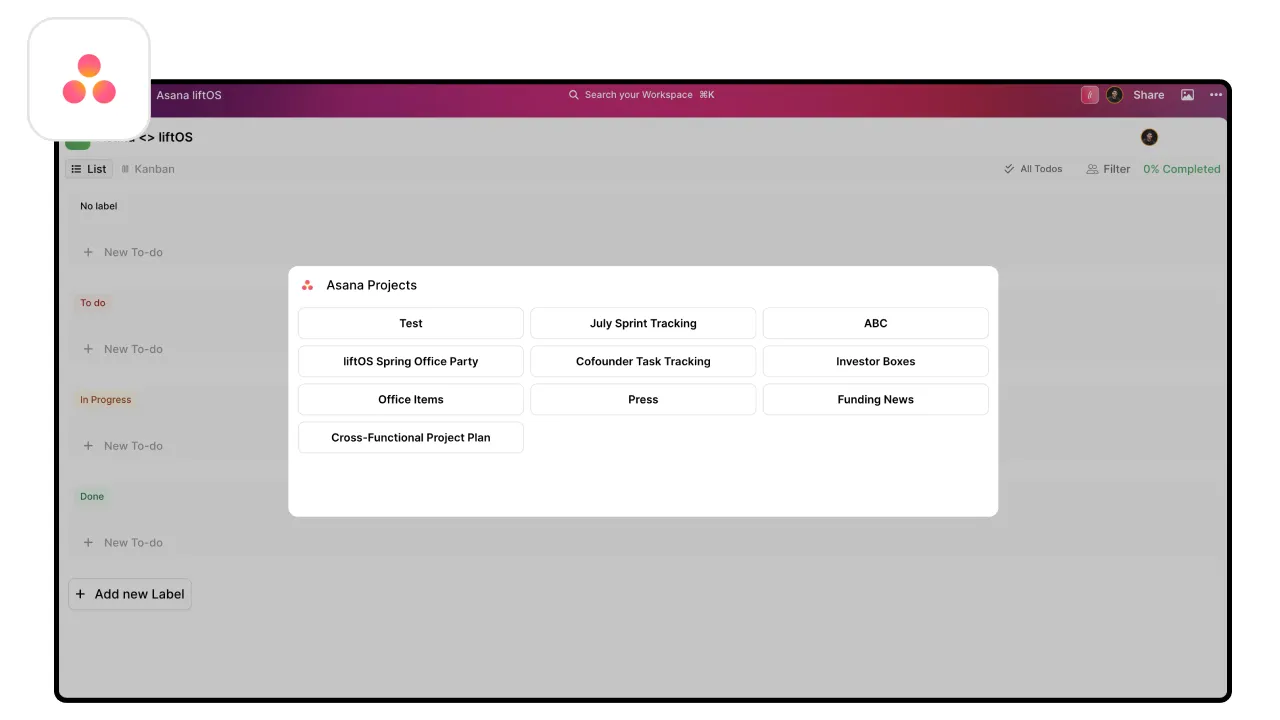 Connect Asana to liftOS and work with all of your tasks, notes and files from one place with ease.