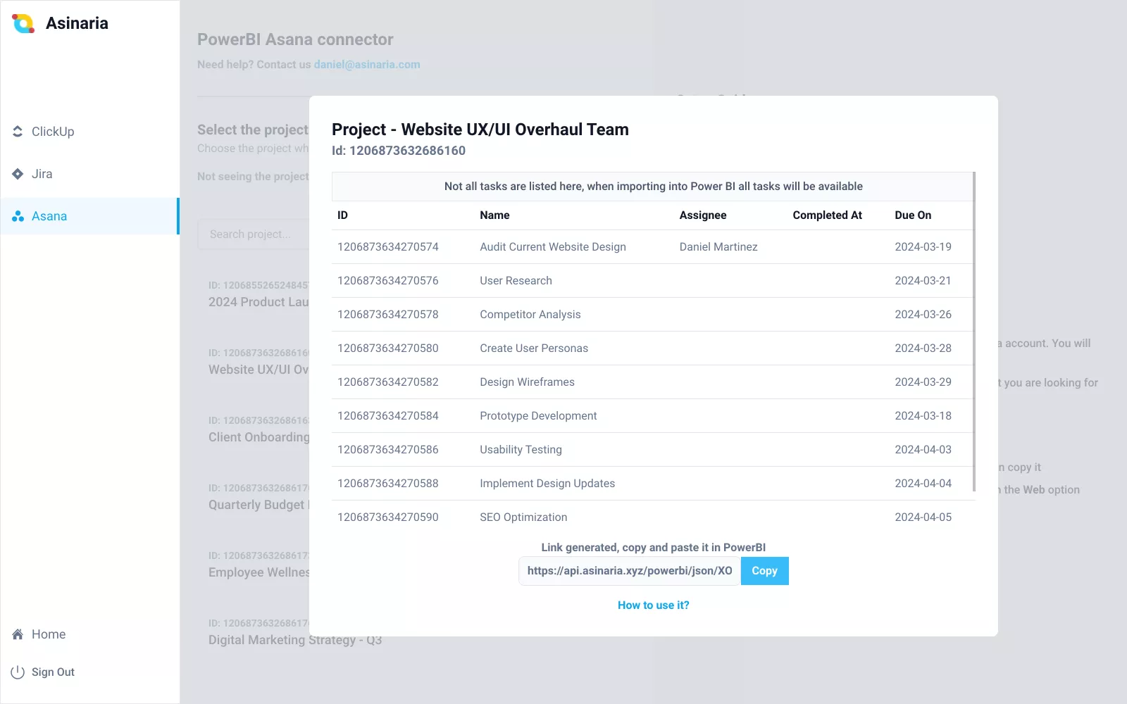Visualize Asana data in Power BI with a link for direct import. Asinaria instantly gathers data from the Asana API, so you have the info you need formatted and ready to use.