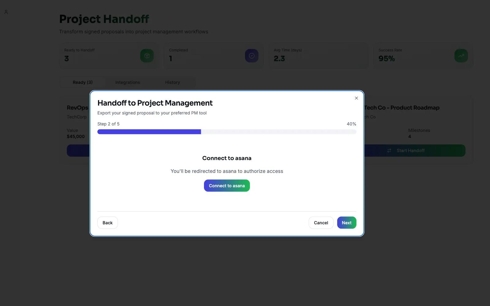 ProposalRelay for Asana automatically turns signed proposals into kickoff-ready projects. When a client signs and funds first Milestone, ProposalRelay creates an Asana project from the approved scope: phases → sections, deliverables → tasks/subtasks, milestones scheduled with due dates, owners assigned, and key files (signed proposal, briefs) attached. Goodbye copy-paste; hello same-day execution.