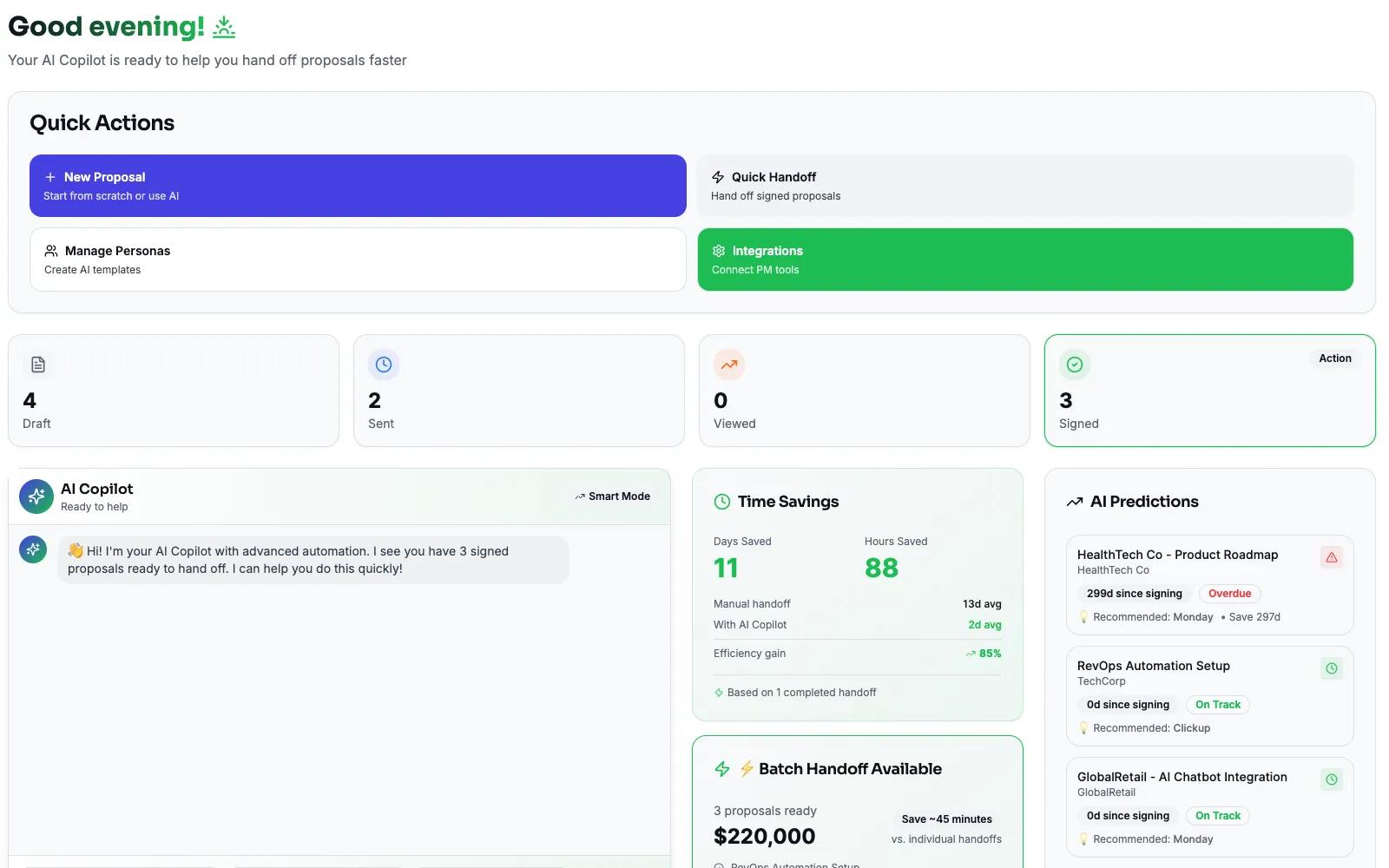 Generate AI proposals, handle objections, take Milestone 1, and auto-create Asana projects.