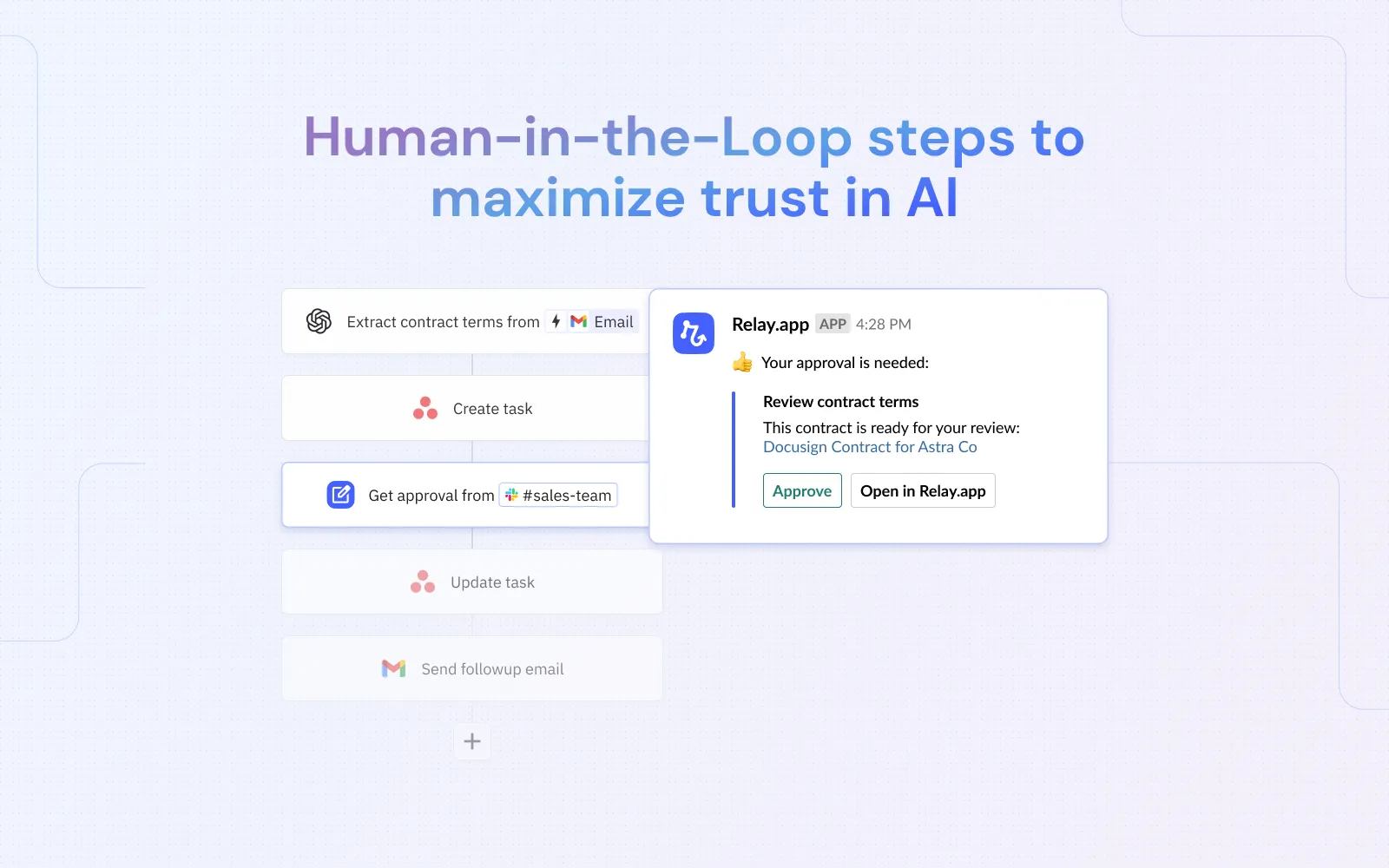 Integrate Asana with your other apps, from Hubspot to Google Workspace to Notion, and more. Get the most out of your automations by leveraging Relay.app's powerful Al and Human-in-the-Loop features.