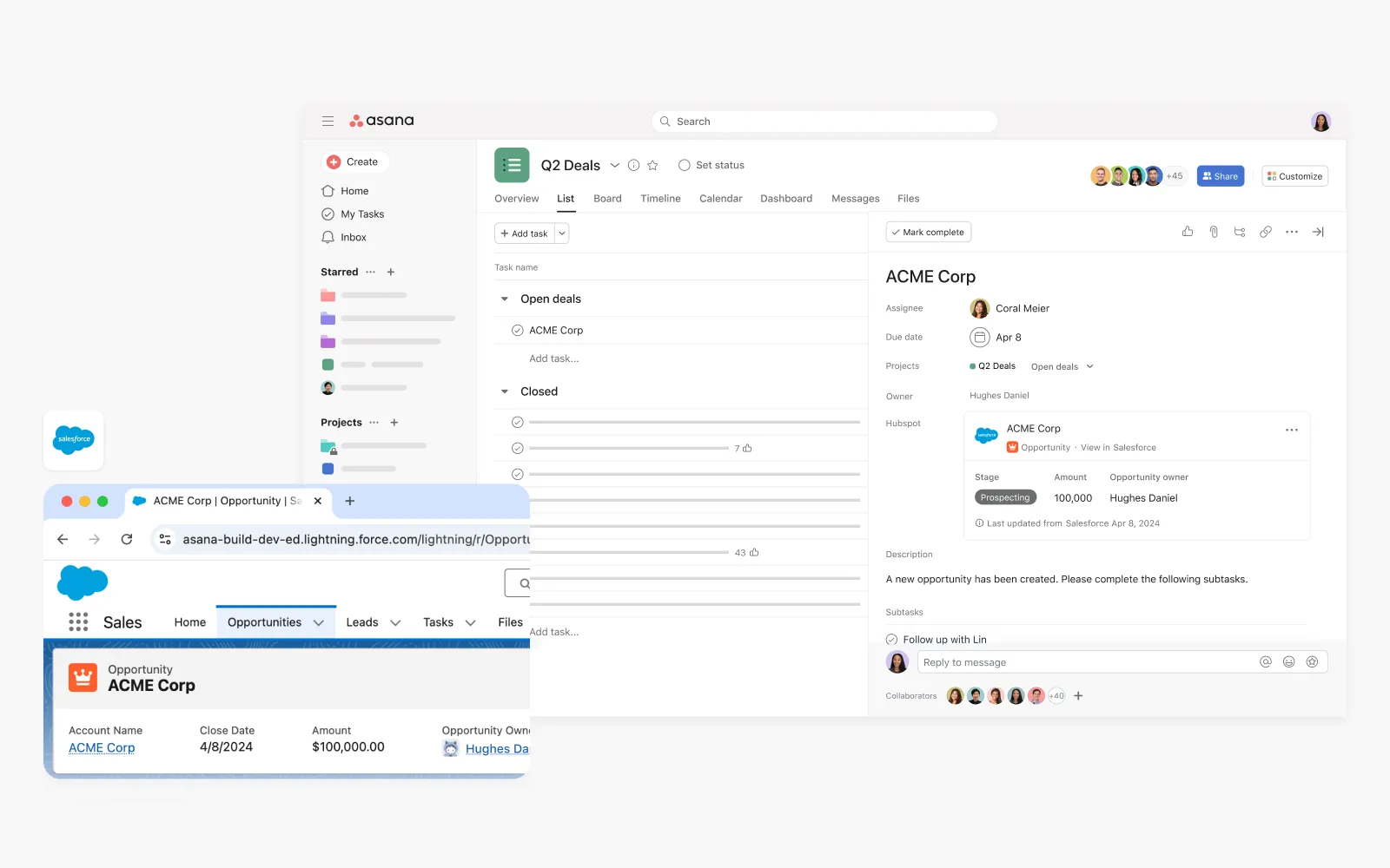 To learn more about using the Salesforce + Asana integration, visit the Asana Help Center.