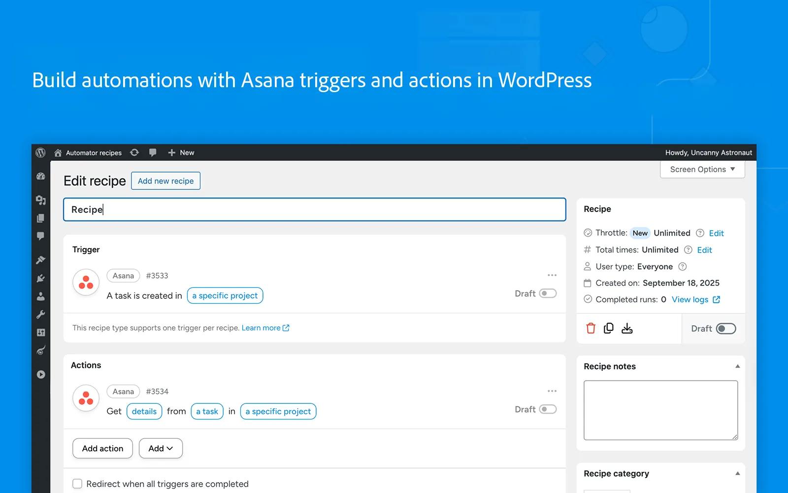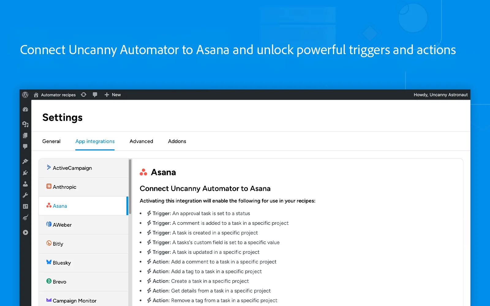 Uncanny Automator connects WordPress with Asana to automate tasks, comments, tags, and project updates
