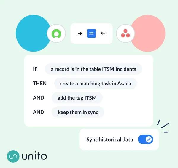 Unito connects Asana to 50+ other leading apps and tools with live 2-way sync. So you create a task in Asana, and that same information appears in your other tool automatically in a ticket, card, issue, incident, record, spreadsheet row, calendar event, and more. It's also one of the only Asana strategic partners and integration platforms available that can easily sync historical data.
