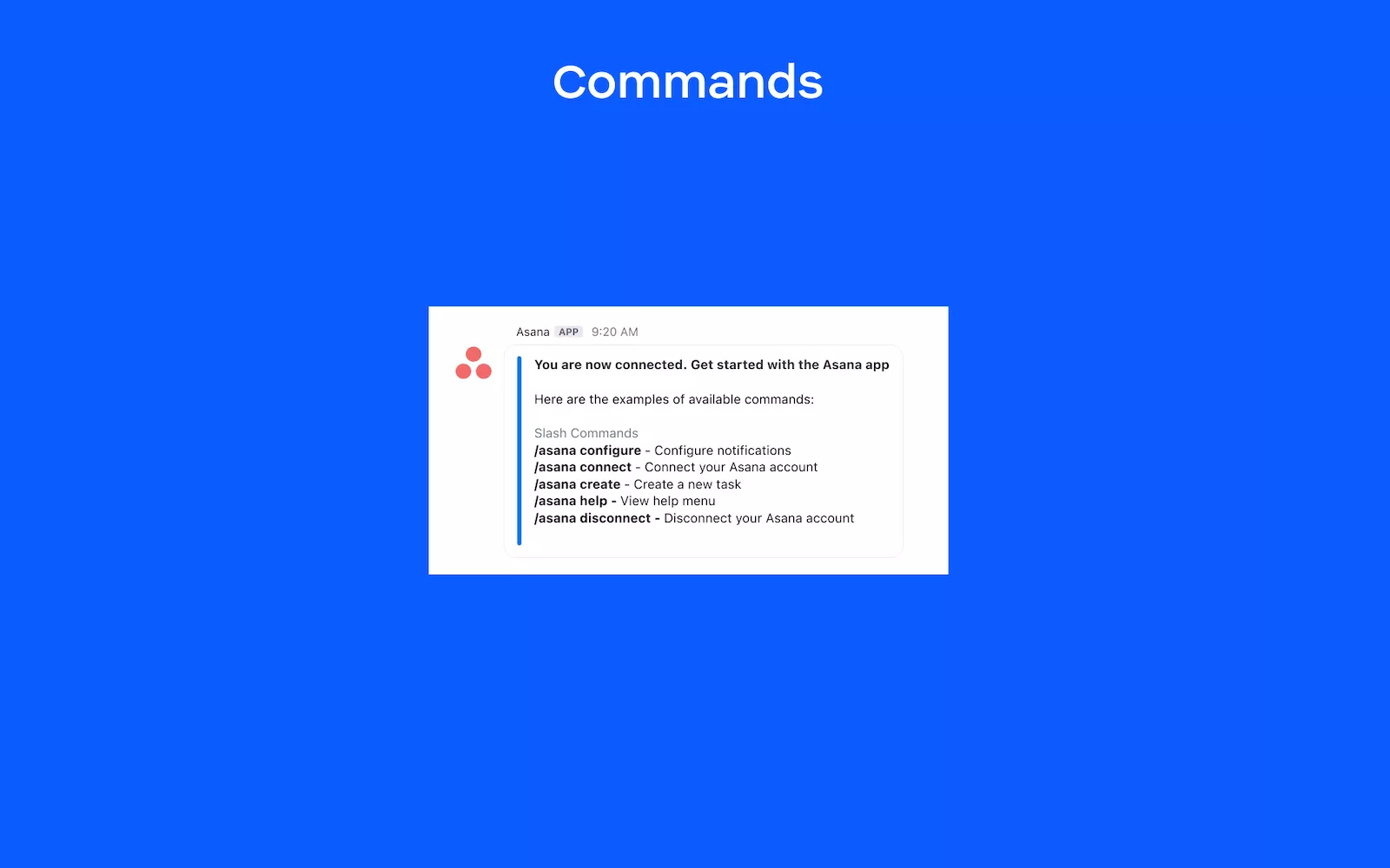 - Use slash commands to create new tasks, configure notifications, connect and disconnect your Asana and Team Chat accounts, and see the full list of the commands available.