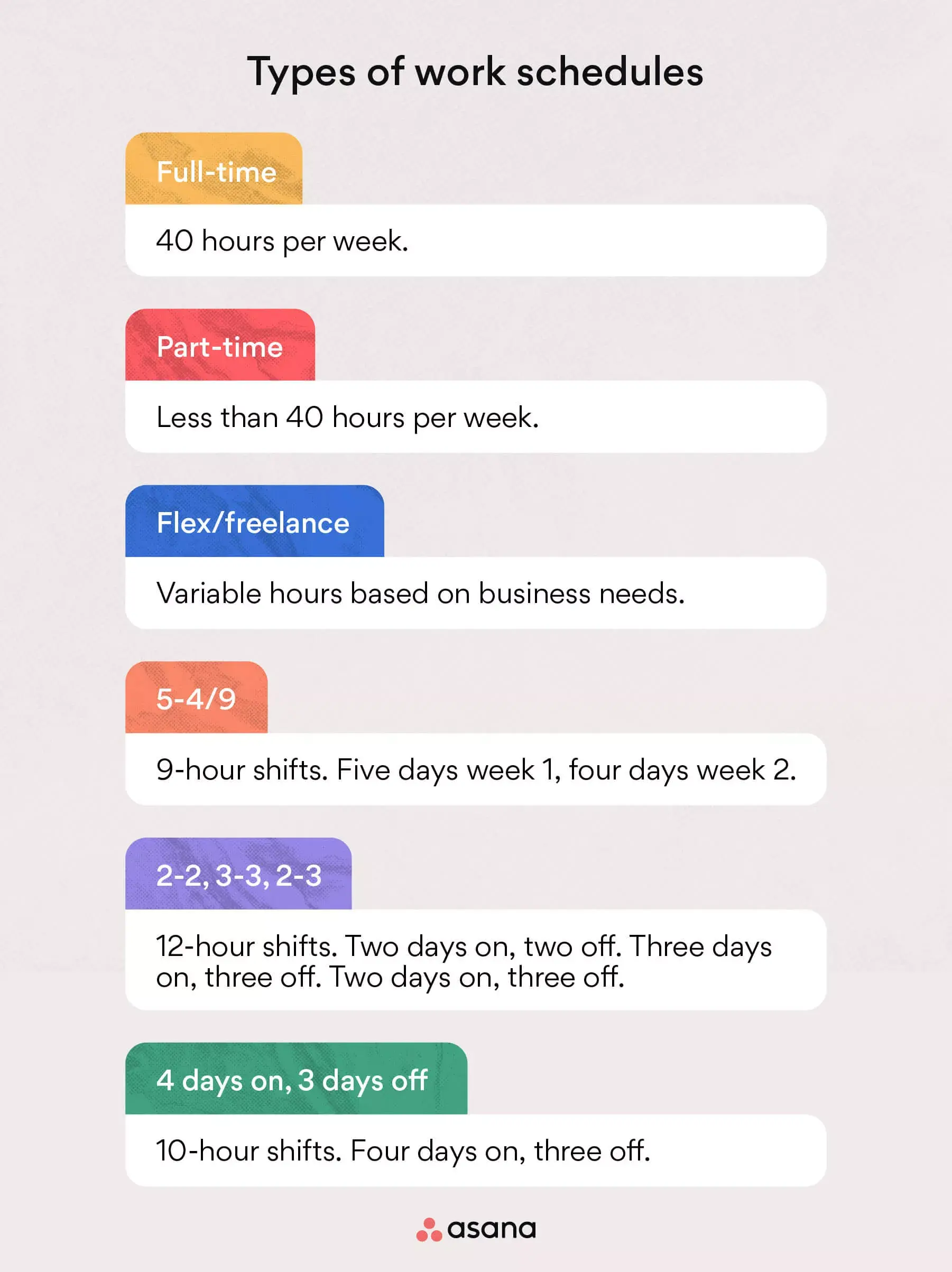 Baca: 3 tata letak manajemen proyek visual (dan cara menggunakannya)Work schedules vary between industries, roles, and countries. A software engineer may work the night shift to keep systems running for daytime workers, and an operations manager may have extended shift schedules to watch over manufacturing.